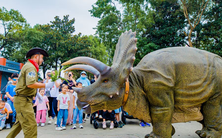 ② 与园区内各处造型逼真的动态恐龙模型互动合影,营造沉浸感。