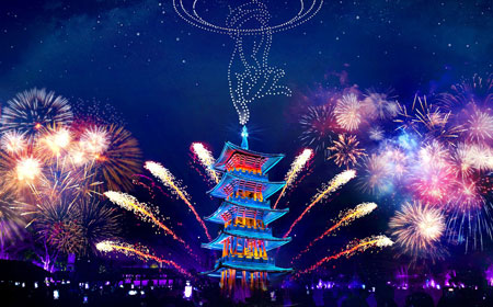 玩法:白天和夜晚定时观看湖中央的“花开五叶”音乐喷泉表演,莲花造型的装置随音乐开合,配合水雾,仙气缭绕。