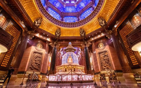 玩法:欣赏这座佛教艺术殿堂的恢弘建筑,观看《觉悟之路》演出,仰望穹顶的飞天壁画,感受精湛的东阳木雕、琉璃壁画等工艺。