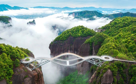玩法:行走于这座刚柔并济的独特桥廊,其造型宛若一柄空中的玉如意,从不同角度欣赏桥本身的建筑之美,并透过桥面玻璃和网格俯瞰深邃峡谷。