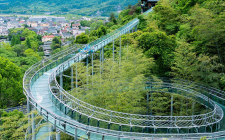 玩法:体验全长约1350米、落差超过百米的玻璃水滑道,乘坐皮艇穿越山谷、林木,将美景与刺激完美结合,是下山的趣味方式。