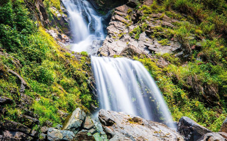 ② "四叠瀑布非常壮观,水流从四级台阶状岩石上层层跌落,在阳光下还能看到彩虹。"