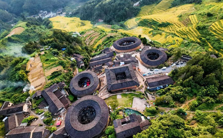 玩法:俯瞰"四菜一汤"全景,拍摄经典俯视图,在最佳位置观赏土楼群与梯田、茶山组成的壮丽画卷。