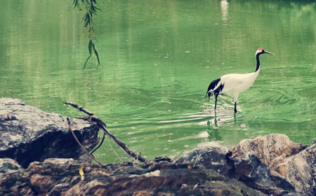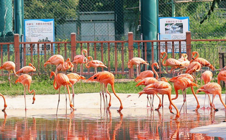 ② 火烈鸟池:拍倒影时轻敲玻璃引其展翅