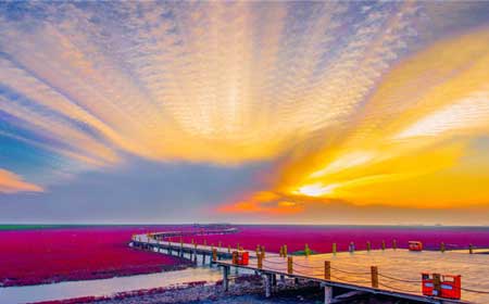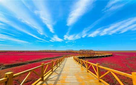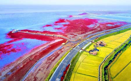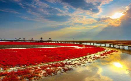 ① 全球罕见的红色海滩:由大面积碱蓬草构成,9-10月呈现最艳丽的红色